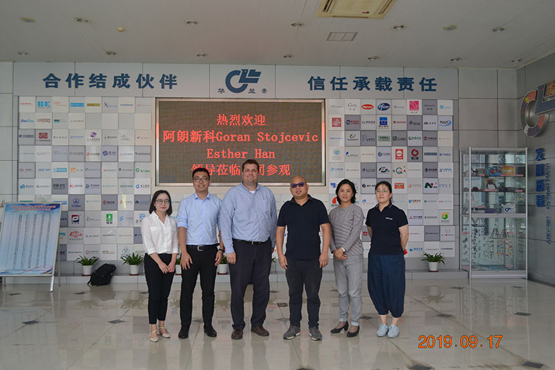 2019年9月17日,阿朗新科新加坡有限公司全球非輪胎產(chǎn)品經(jīng)理Goran Stojcevic、亞太區(qū)技術(shù)服務(wù)與應(yīng)用開發(fā)總監(jiān)Esther Han,以及中國區(qū)的技術(shù)經(jīng)理蒞臨華蘭參觀交流,由公司總經(jīng)理華一敏親自接待。